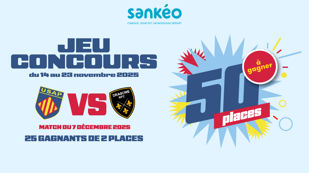Du 14 au 23 novembre 2025, participez à notre jeu concours et tentez de remporter 2 places pour le match USAP vs Dragons RFC qui se déroulera le 7 décembre prochain.
